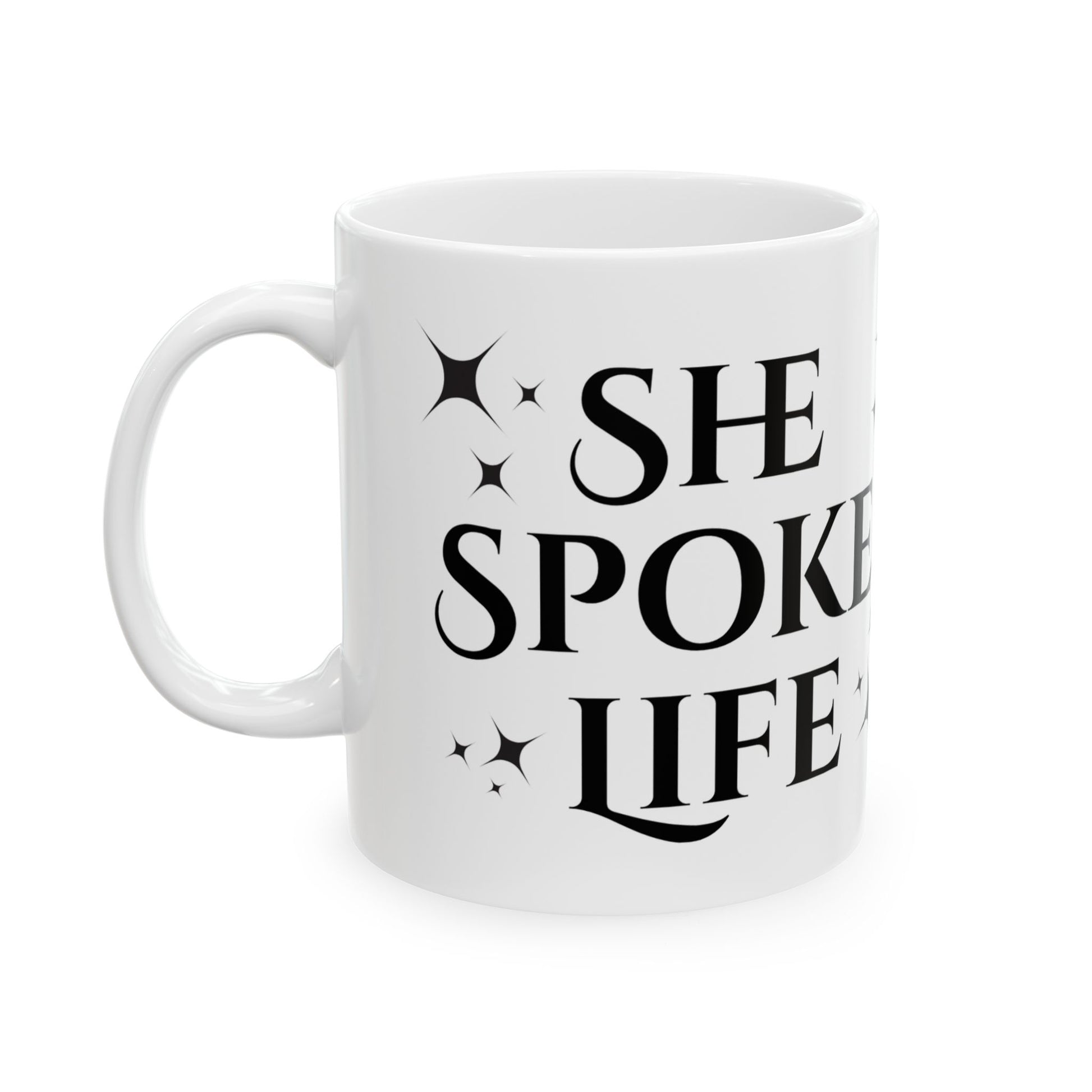 Start your day with words that matter. This elegant mug features the empowering phrase She Spoke Life alongside a bold, hand-drawn lily and shimmering star accents — a reminder that your words hold power, beauty, and growth. Perfect for coffee, tea, or your favorite warm drink, it’s more than a mug — it’s a daily affirmation in your hands.
